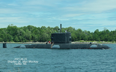 The submarine HMCS Windsor , with the Admiral aboard, made a trip to Bedford Basin and returned to the lower harbor to take the salute.