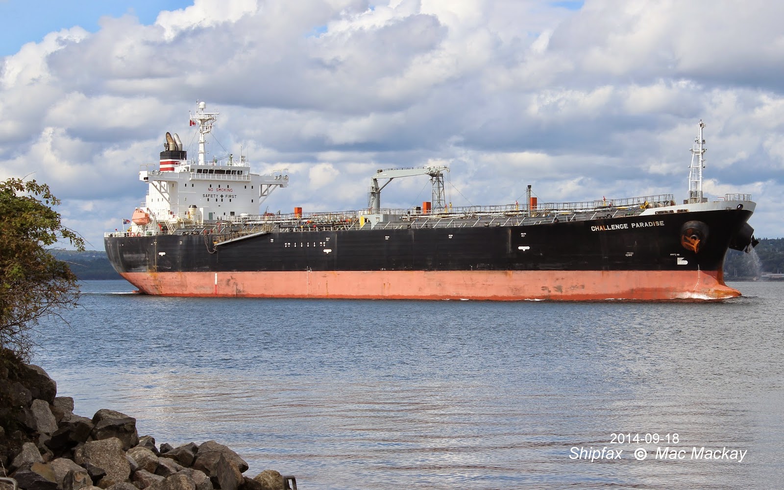 The Panamanian flag tanker Challenge Paradise arrived in Halifax on September 17 and anchored in Bedford Basin. The next day it moved to Imperial Oil dock 3 and back to anchor on the 19th.